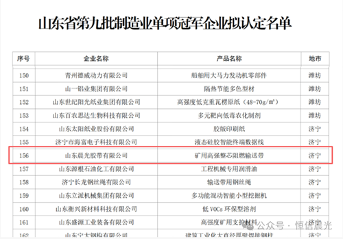 近日,山東省工業(yè)和信息化廳正式公布第九批制造業(yè)單項(xiàng)冠軍企業(yè)名單,憑借在礦用阻燃輸送帶領(lǐng)域的卓越表現(xiàn)與領(lǐng)先技術(shù),山東晨光膠帶有限公司成功入選,彰顯了其作為全國(guó)輸送帶行業(yè)TOP10企業(yè)的綜合實(shí)力與全球領(lǐng)先的阻燃輸送帶解決方案提供者的地位。