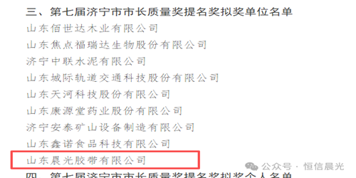 近日,山東晨光膠帶有限公司憑借卓越的質(zhì)量管理和行業(yè)領(lǐng)先的綜合實力,成功榮獲濟寧市“市長質(zhì)量獎提名獎”。這一榮譽是對公司在質(zhì)量管理、技術(shù)創(chuàng)新和市場競爭力方面的高度認可。