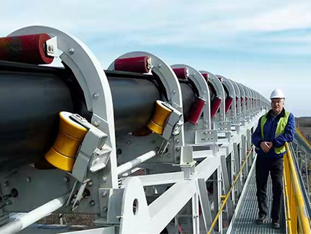 目前運(yùn)用輸送帶輸送散裝物料絕大多數(shù)采用平帶輸送,平輸送帶鋪設(shè)在輸送機(jī)上,靠輸送機(jī)的側(cè)輥槽角自然成槽,承載著物料運(yùn)行輸送。這種輸送結(jié)構(gòu)易使散裝物料粉塵飛揚(yáng)、灑落,或含溶劑物料流淌,造成嚴(yán)重環(huán)境污染和物料損失。橡膠管狀輸送帶是管帶輸送機(jī)的主要配套設(shè)備,它是基于上述輸送缺陷,以整個(gè)輸送過程中輸送帶輸送物料時(shí)形成管狀,全程物料在密閉系統(tǒng)中輸送,實(shí)現(xiàn)小半徑空間轉(zhuǎn)彎、大傾角布置等技術(shù)特點(diǎn),該項(xiàng)目也完全適應(yīng)當(dāng)前環(huán)保需求。